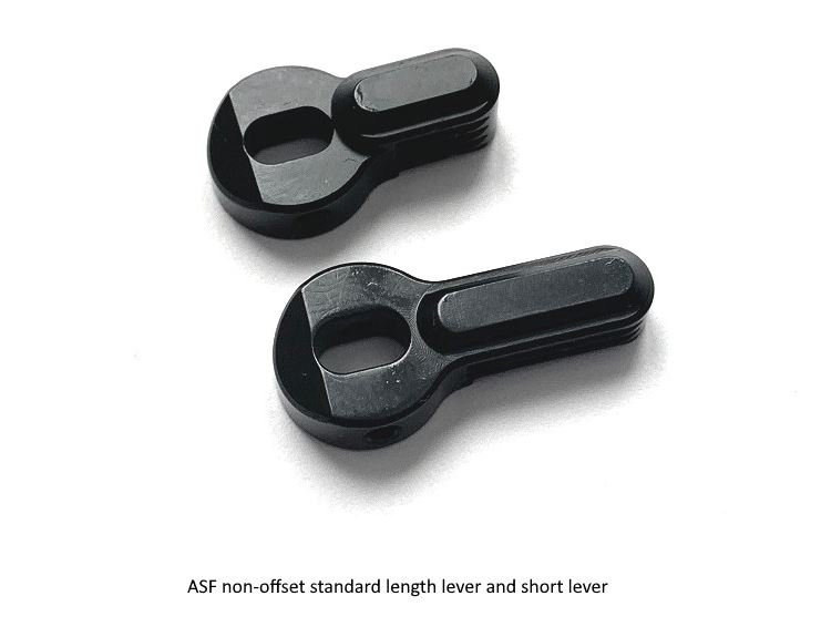 We are known to many for the dimpled pattern we use on some control surfaces (AA, or All Angles, is our designation). ASF levers are serrated, not dimpled. As the lever rotates, the user’s finger slides on the lever, anything but serrations along the length of the lever only impedes that movement and creates friction for no benefit. Serrations diagonal or perpendicular to the length of the lever are similarly unhelpful. Serrations parallel to the lever’s length help mitigate lateral movement, and do not impede the finger’s sliding motion. ASF lever’s profile isn’t square, its outer most portion is somewhat tapered for a reason. When the user’s hand holds the pistol grip, the profile of the ASF lever conforms to angle of the thumb’s pad. For our friends and customers that wish to see dimples on the ASF, there is a single dimple on both sides to function as a position indicator (in lieu of a pointer), it’s elegant and simple.
